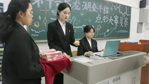 在倒计时五秒后,比赛正式开始。比赛现场,选手们各不相让似蛟龙出海、猛虎下山。小小的教室里充斥着纸钞翻飞的声音,只见选手们的手指灵活地在纸钞上跳跃呈现出黑红交织的“刀光剑影”。每一位选手都竭尽所能,或二指或五指、或扇形,无不完美诠释了独属于会计的“钞”能力。