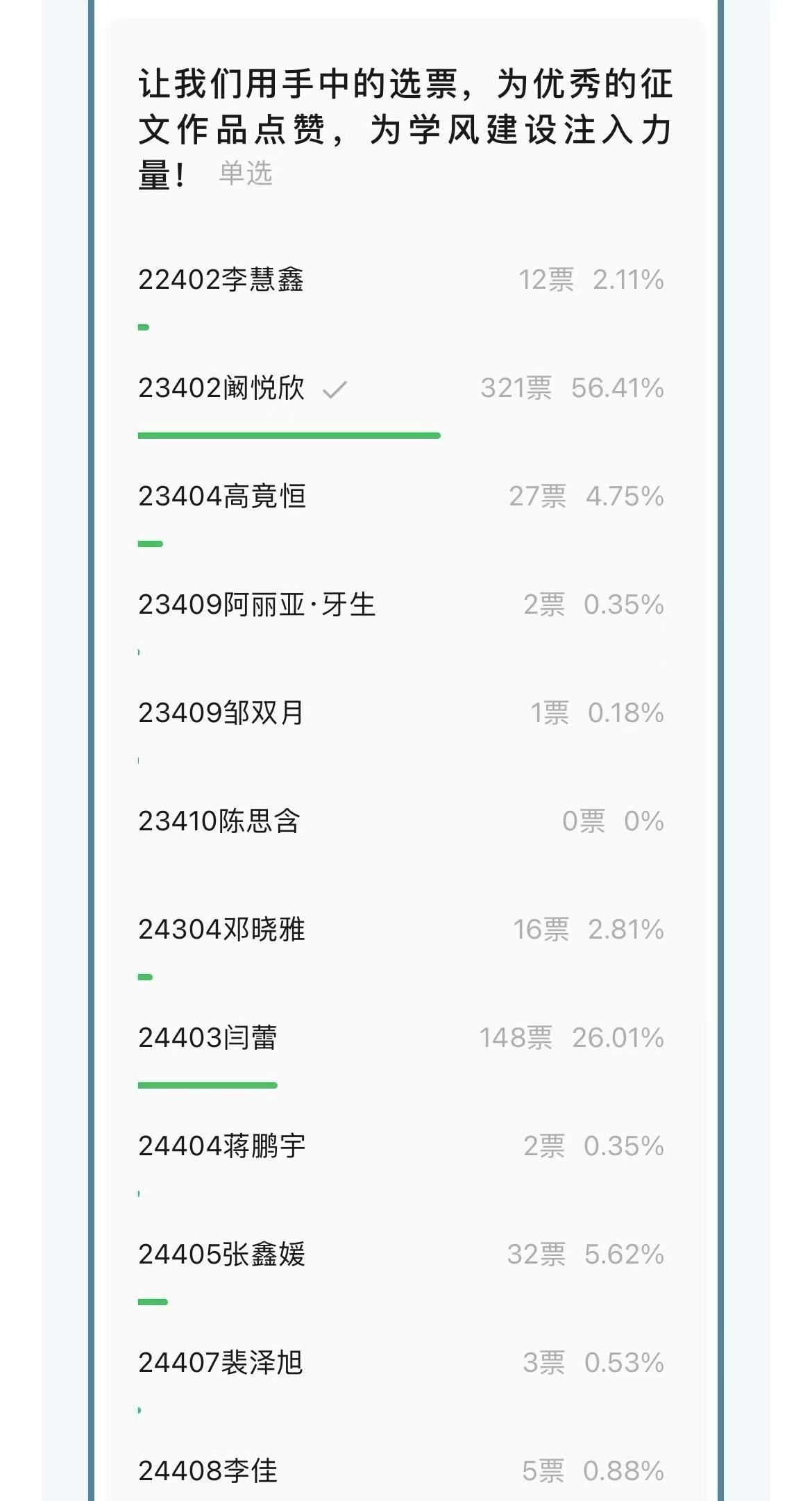 让我们用手中的选票,为优秀的征文作品点赞,为学风建设注入力量!期待在大家的共同努力下,我们的校园能形成更加浓厚的学习氛围,让每一位同学都能在优良学风的滋养下茁壮成长。