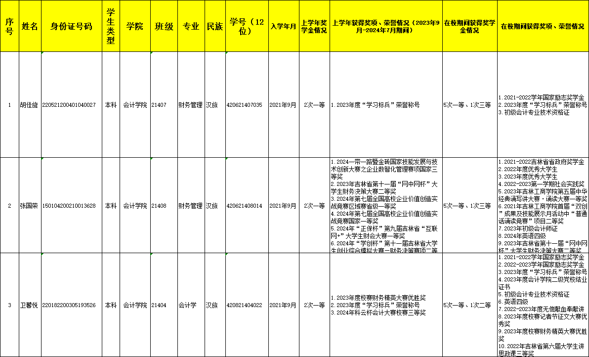 会计学院评审小组按照国家奖学金评选要求,综合考察学生思想品德、学习成绩、工作表现以及参加社会实践等情况,追加会计学院21404班卫馨悦,21407班胡佳旋,21408班张国荣等三名同学为2024年国家奖学金获得者。